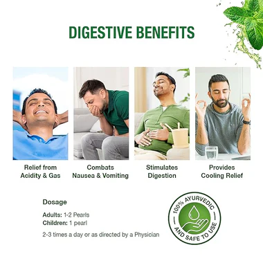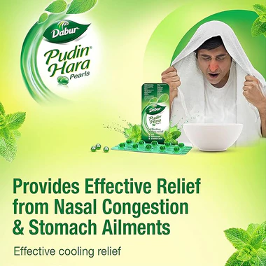 Dabur Pudin Hara Pearls is an Ayurvedic capsule that helps relieve indigestion, gas and acidity. With Pudina Satva as the main ingredient, it provides quick and effective relief from stomach ailments. It helps reduce indigestion and enhances digestion and provides effective cooling relief from digestive ailments. When taken with steam inhalation, this aromatic Ayurvedic capsule also improves respiratory health and provides effective relief from nasal congestion. It helps provide the body with much-needed warmth and relieves cough, cold and blocked nose as well.